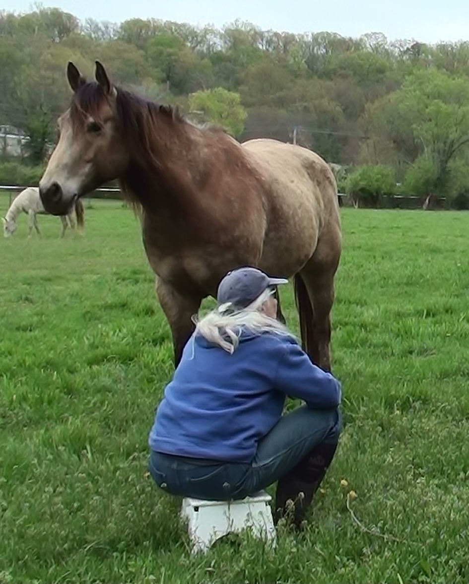 First and most basic: hang out with your horse in the pasture. I’m not going to go into any detailed explanations of any of Carolyn’s work—for that, you’ll need to get her book or videos, take her online course, or (best of all) attend a clinic. The important thing here is that our class assignment was to hang out with our horse in the pasture or arena. That’s it, at the beginning. Forget about any agenda, and don’t even pay attention to the horse unless he becomes a pest.