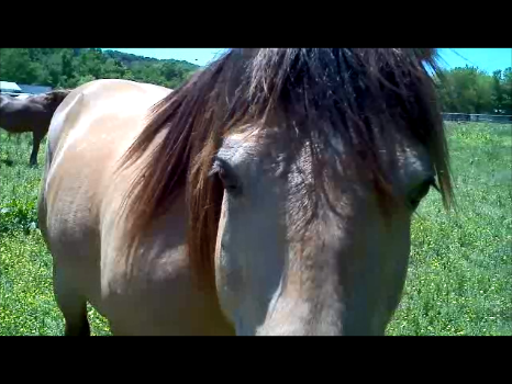 When he first followed me into the west pasture, Galahad immediately started walking toward the main gate. I stopped him (which he does willingly) and asked him to walk with me toward where the treat piles were set up. He followed for a few steps, then refused and put on his “stubborn face.” That’s the expression he often uses when you first ask him to do anything that’s not his own idea.